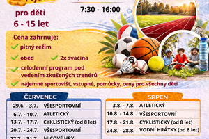 ☀️🏃♂️ LETNÍ PŘÍMĚSTSKÉ KEMPY 🏀🌊 Hledáte pro své děti smysluplný program na léto plný pohybu, her a nových kamarádství? Přihlaste je na naše letní příměstské sportovní kempy! 💪 ✅ všestranný sportovní program ✅ atletika, míčové hry, pohybové soutěže ✅ koupání a venkovní aktivity ✅ týmové hry a zážitky ✅ zkušení trenéři a bezpečné prostředí Kempy jsou vhodné pro děti, které milují pohyb i pro ty, které chtějí objevit nový sport a zažít léto aktivně.